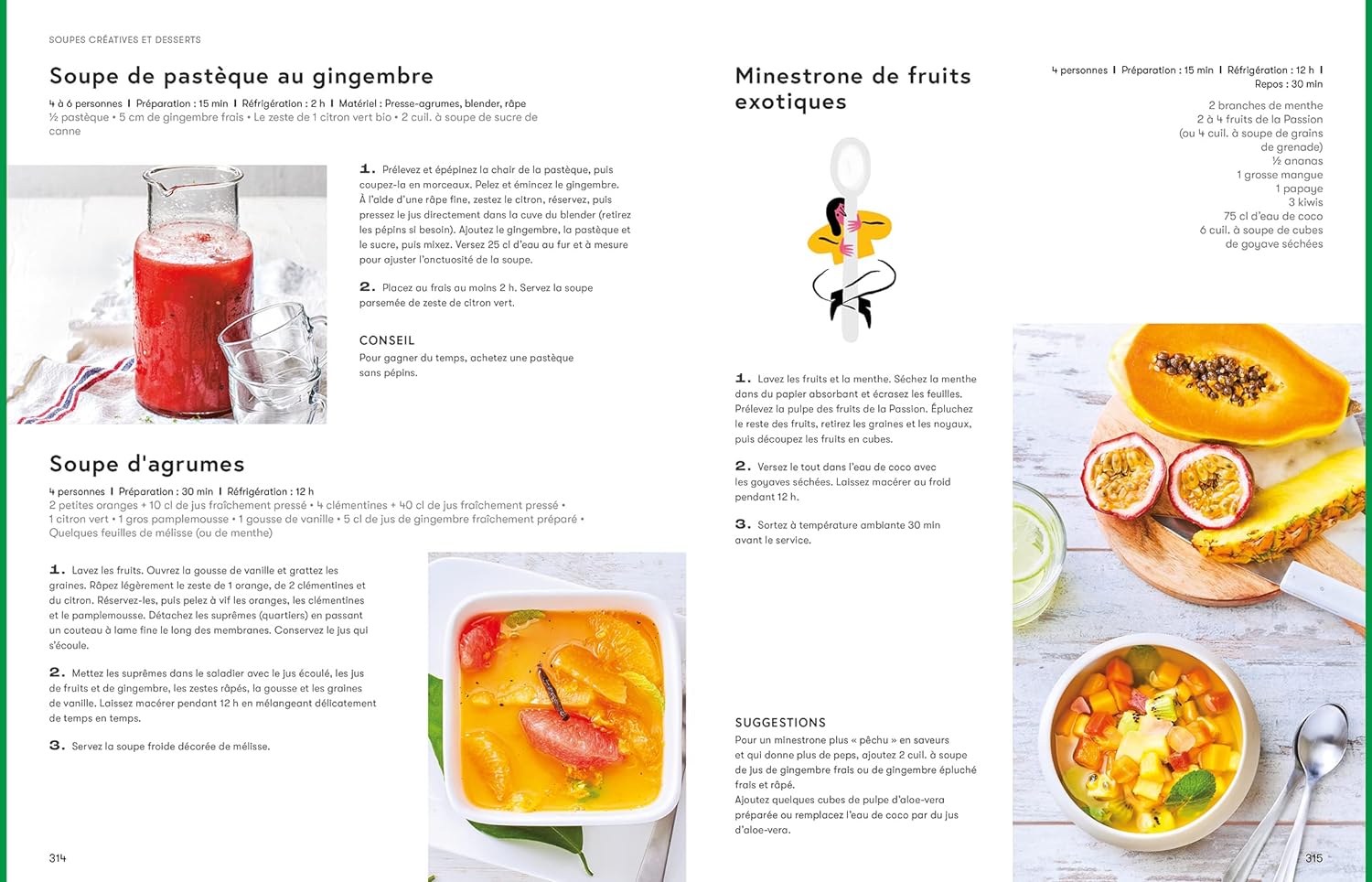 Soupes sucrées, bouillons exotiques, veloutés de fond de placard… Les recettes, variées et inventives, s’adaptent à chaque saison. Des photos alléchantes accompagnent chaque création. De quoi inspirer les cuisiniers en herbe comme les cordons bleus !