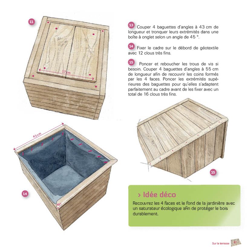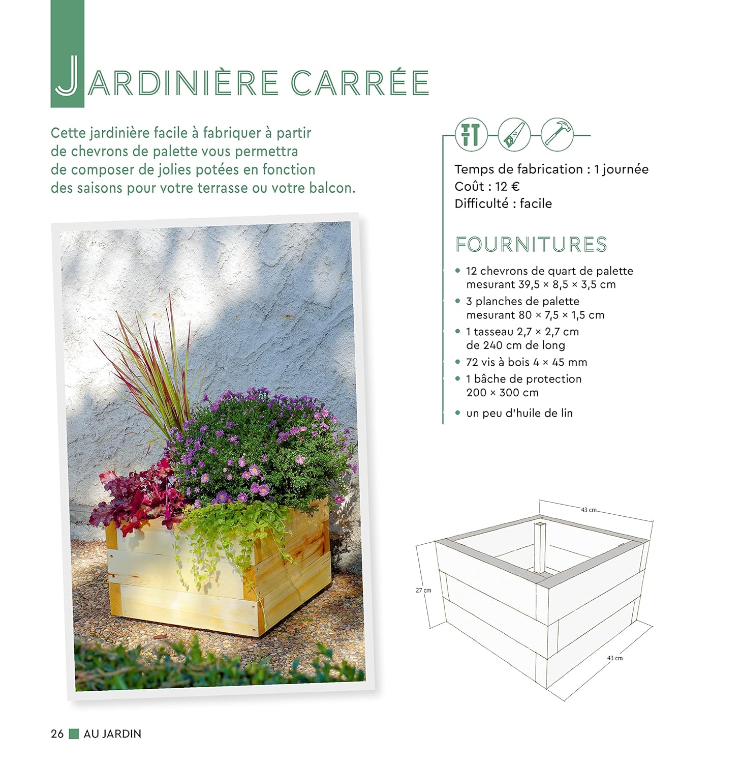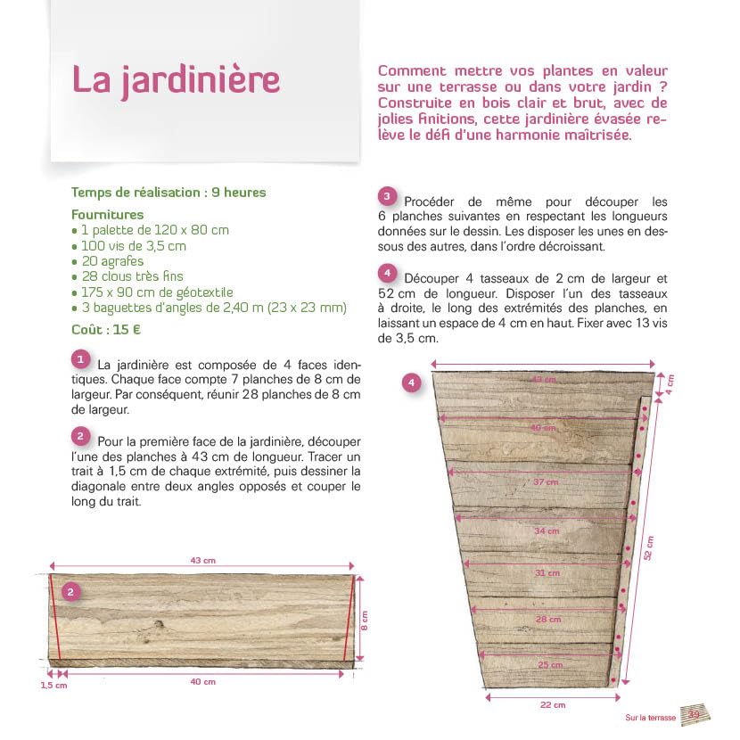 Découvrez dans ce livre 16 modèles pour aménager votre jardin à peu de frais, rapidement, sur mesure et sans difficulté ! Terrasse, jardinière, coffre de rangement, bacs de culture et de rempotage, bar, canapé, table, chaises, banc…