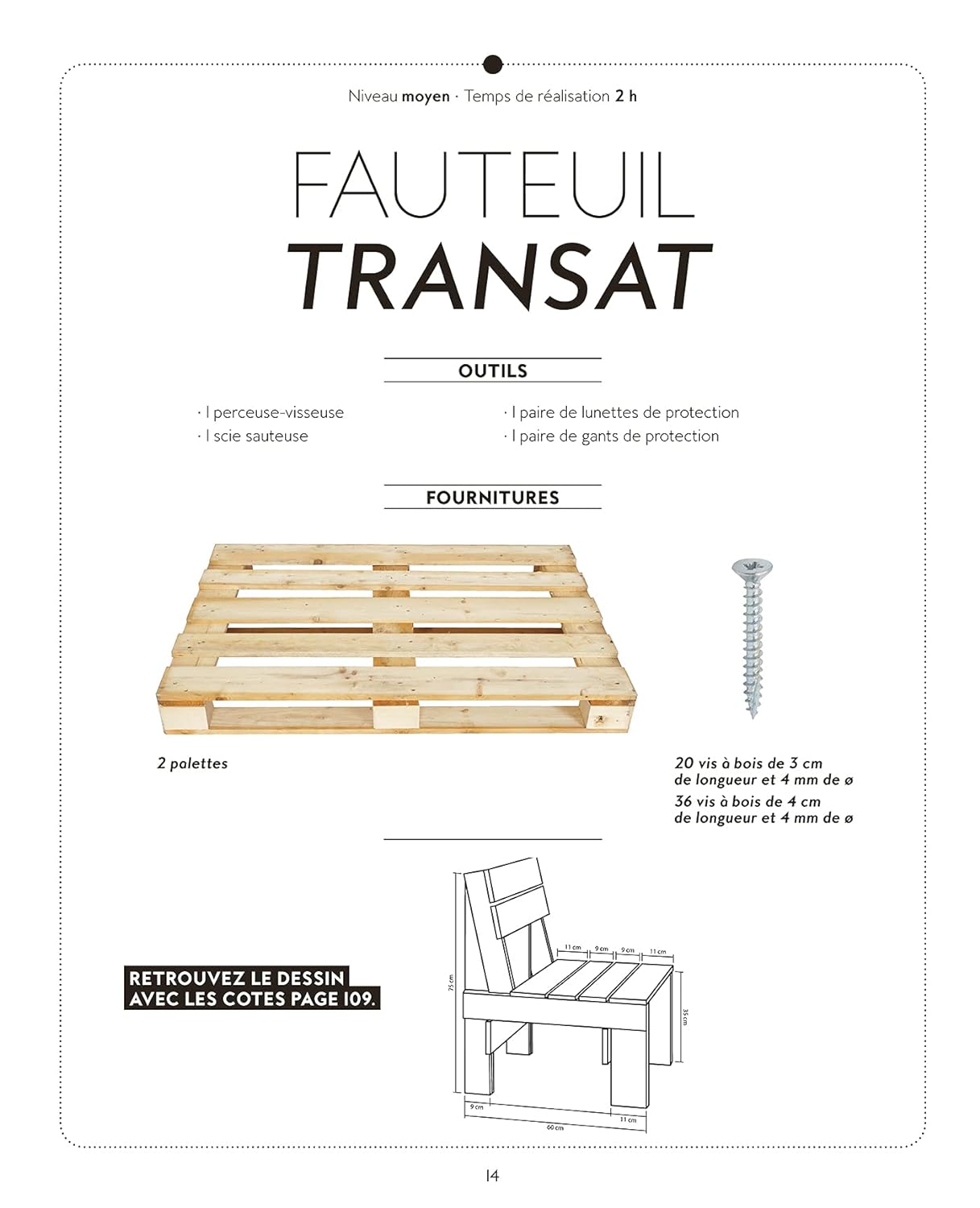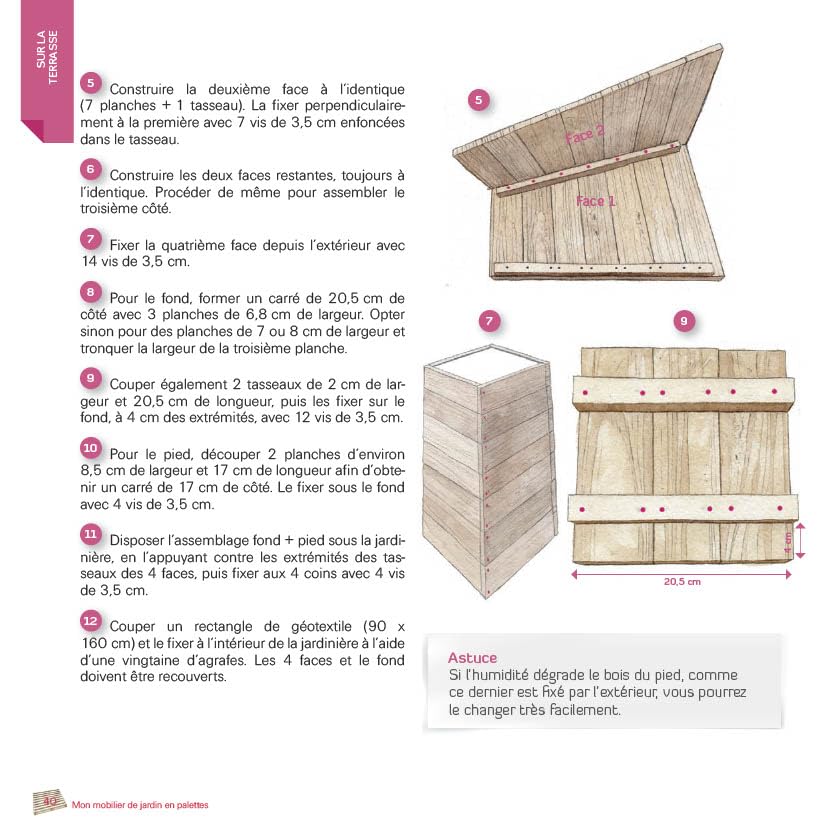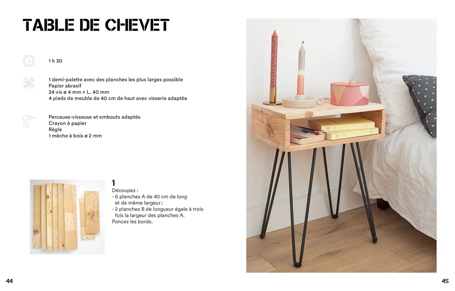 Une ou deux palettes, quelques vis, du petit matériel de base, trois outils – une perceuse-visseuse, une scie sauteuse et une scie sabre –, des techniques faciles à acquérir et surtout des explications simples, des trucs et astuces ingénieux… Voilà tous les ingrédients pour fabriquer en moins de 2 heures et toujours avec un petit budget des meubles et des objets inattendus, design et intemporels qui sortent de l’ordinaire…