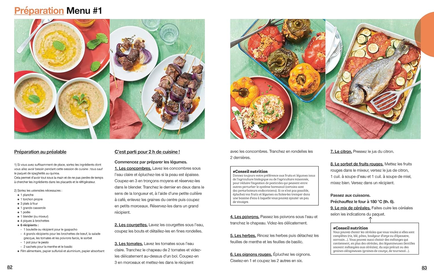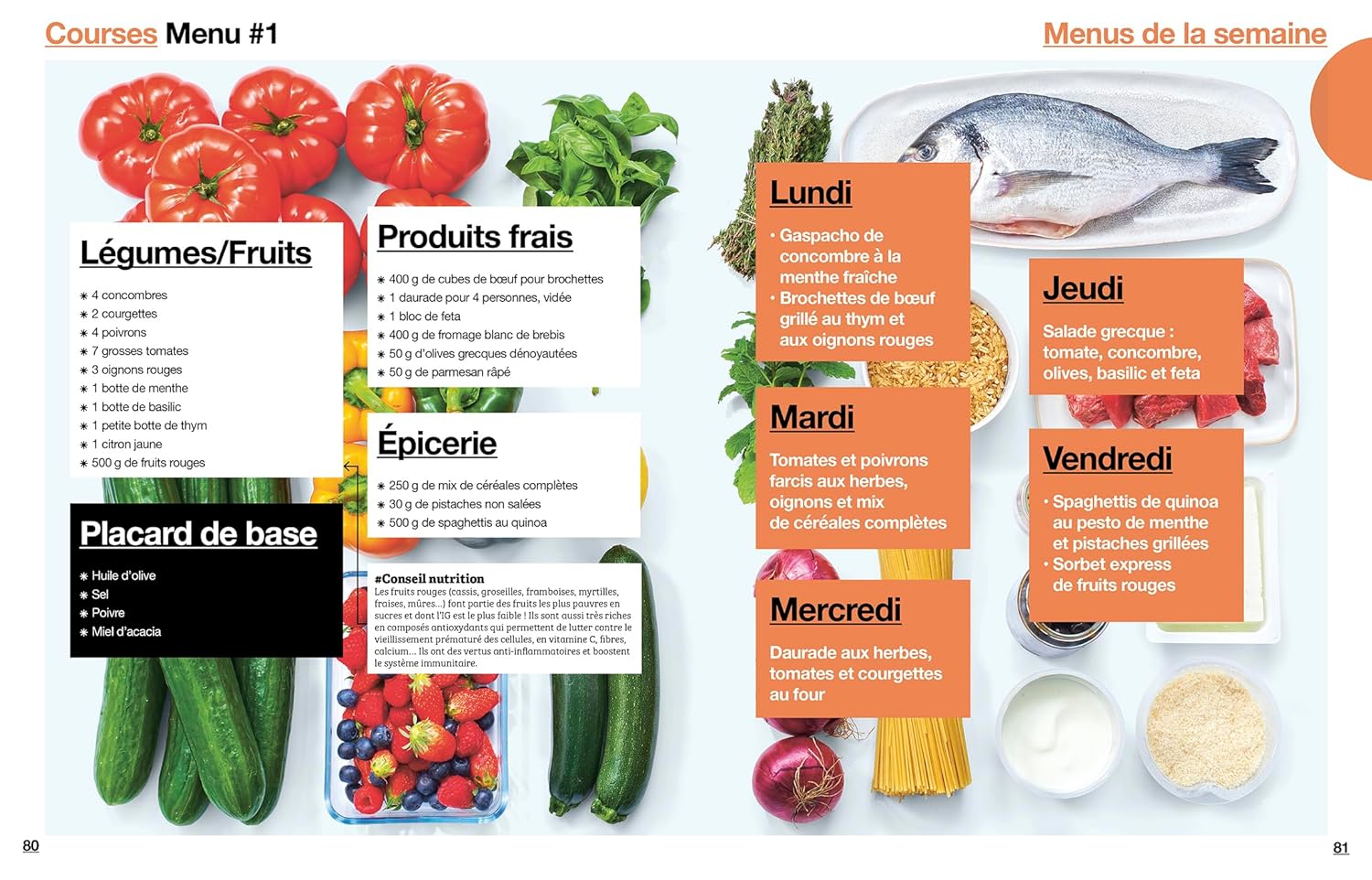 Chaque semaine, vous trouverez une liste de courses, un déroulé des préparations et des conseils diététiques pour mieux manger. Le soir, assemblez votre repas en moins de 15 minutes. Plats mijotés, gratins, soupes… Cuisinez des produits frais et de saison dans une démarche zéro déchet.