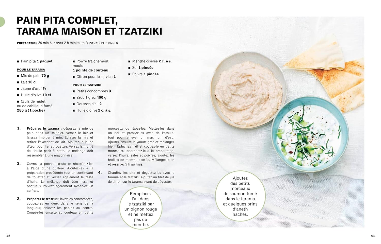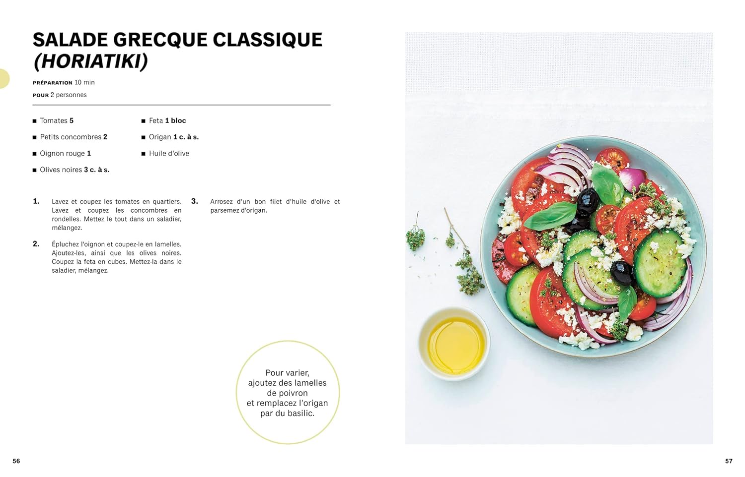Grâce à des fiches techniques, elle vous accompagne dans la métamorphose de votre alimentation. Composez des menus équilibrés avec des mets emblématiques comme les toasts de dakos à l’avocat et à la feta, les brochettes d’agneau ou encore la salade d’oranges à l’huile d’olive.
