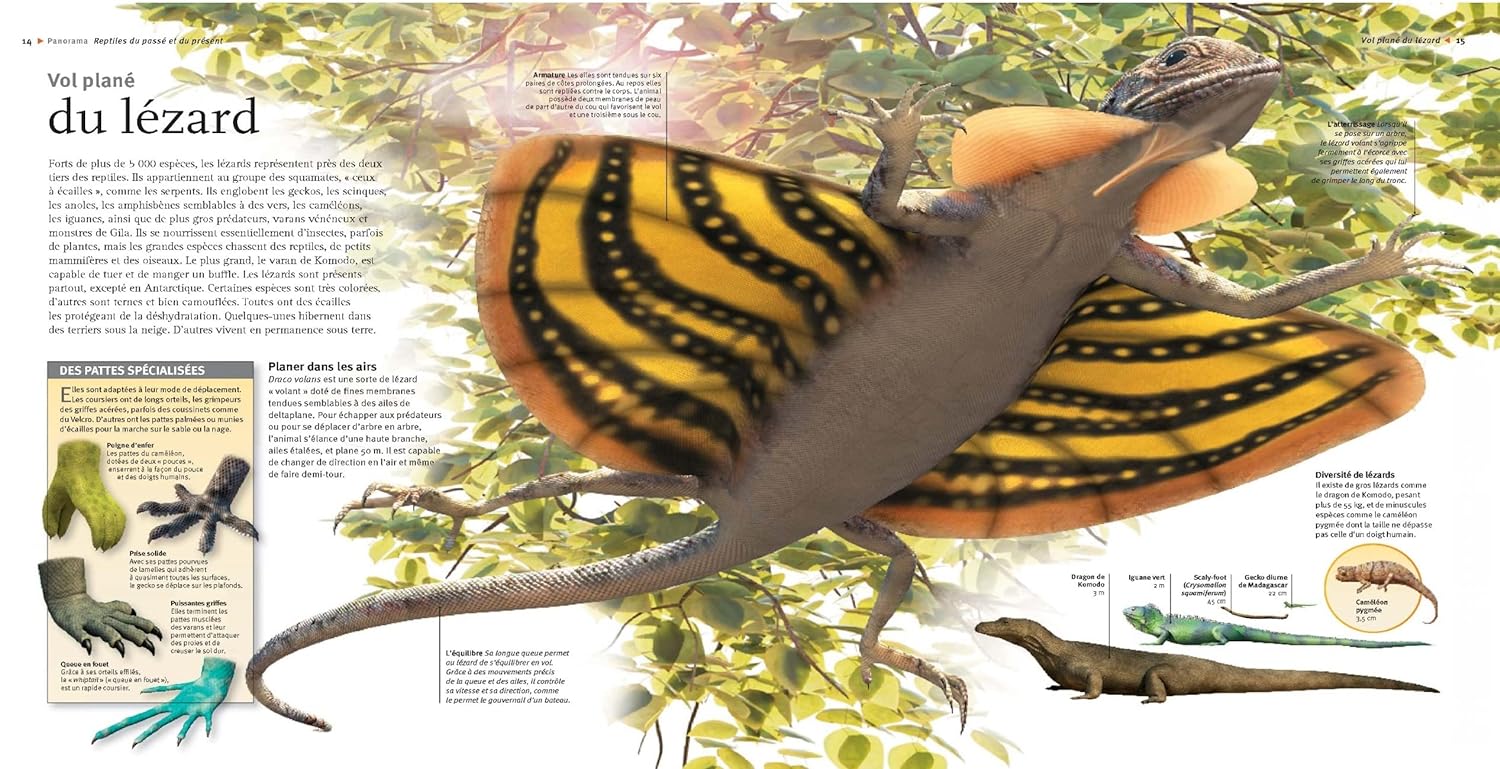 La première moitié de l’ouvrage offre un grand panorama de présentation des reptiles : qu’est-ce qu’un reptile ? Quelles sont les caractéristiques communes aux reptiles ? etc.