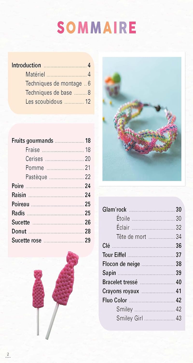 Ce livre présente 60 modèles de scoubidous classiques et de petits objets, grigris et bijoux entièrement réalisé avec des fils à scoubidous. Des scoubidous en tout genre (ronds, carrés, spirales…) à 3 ou plusieurs fils, mais aussi des fruits, des gourmandises, des légumes, des fleurs… à tresser facilement étape par étape.