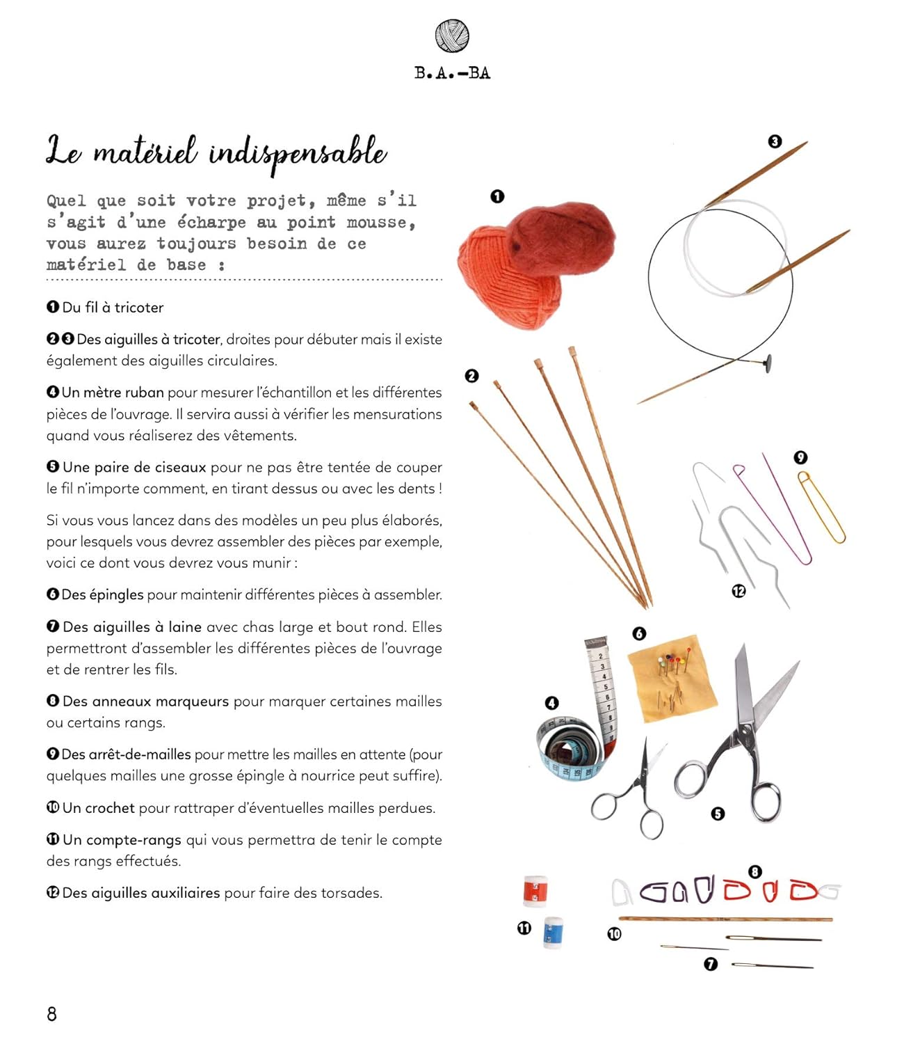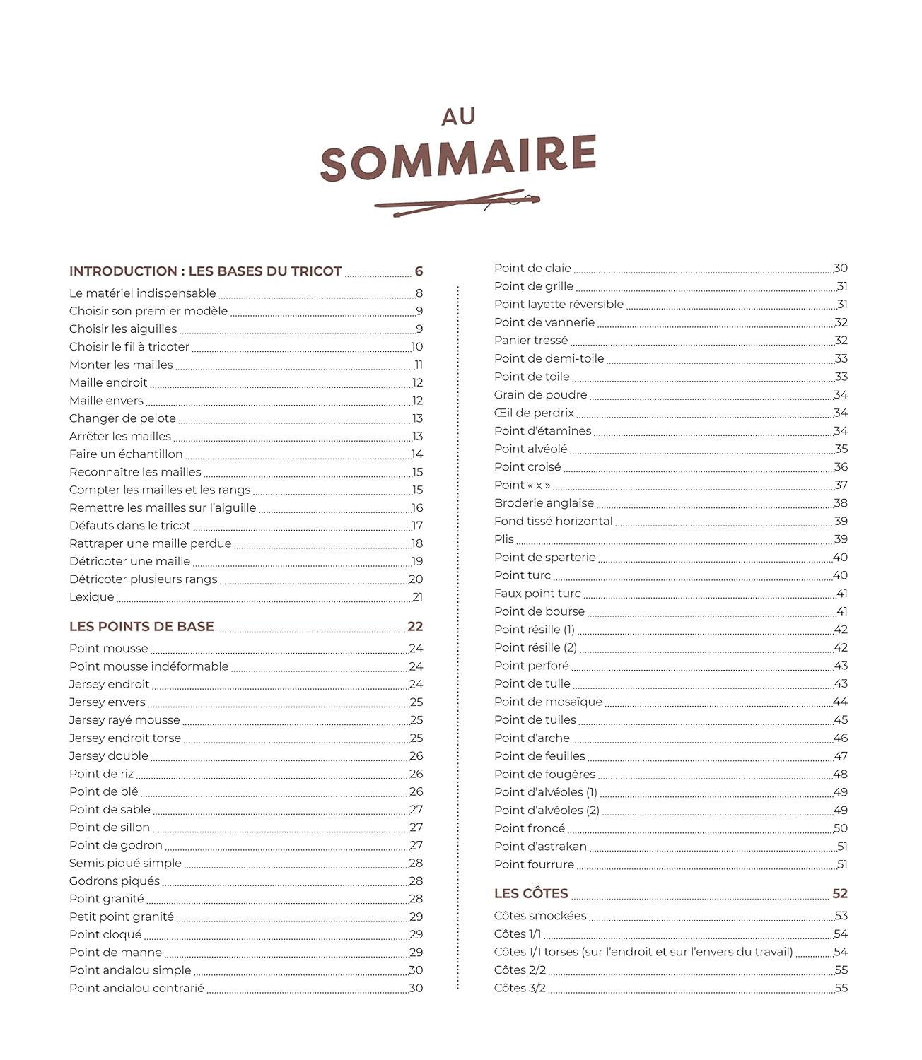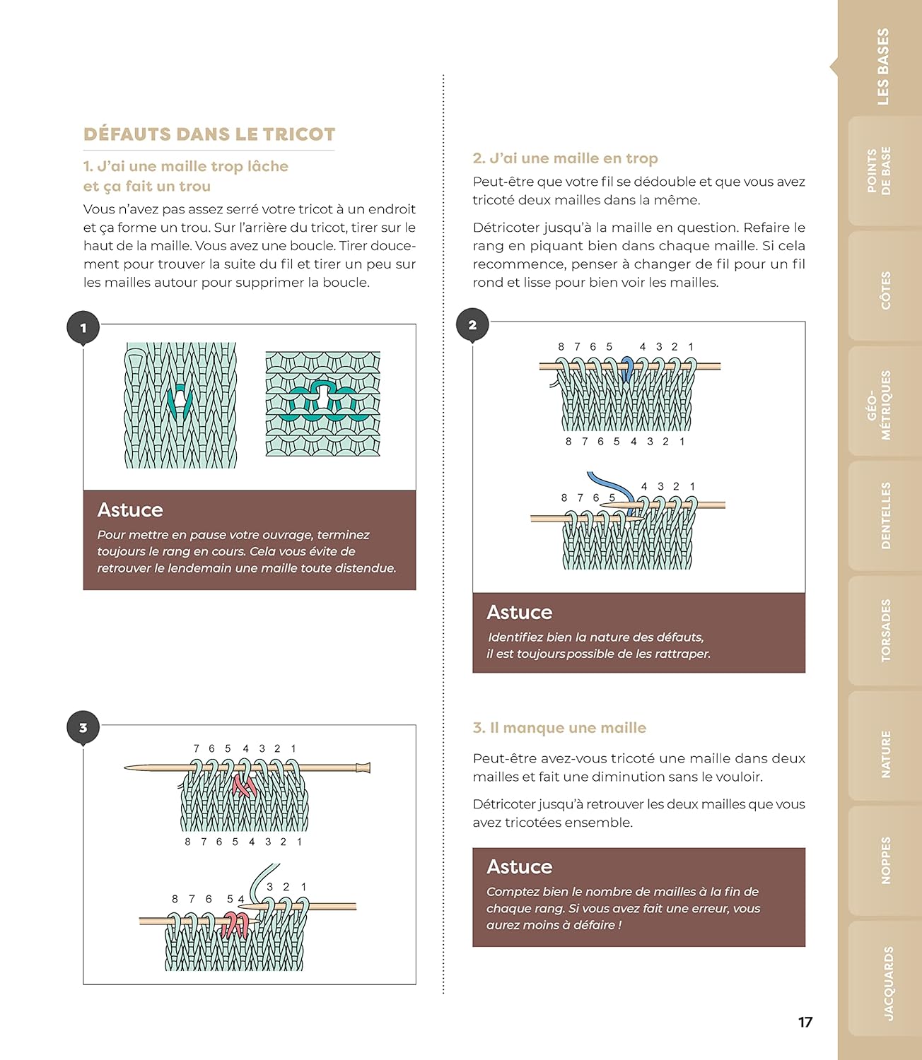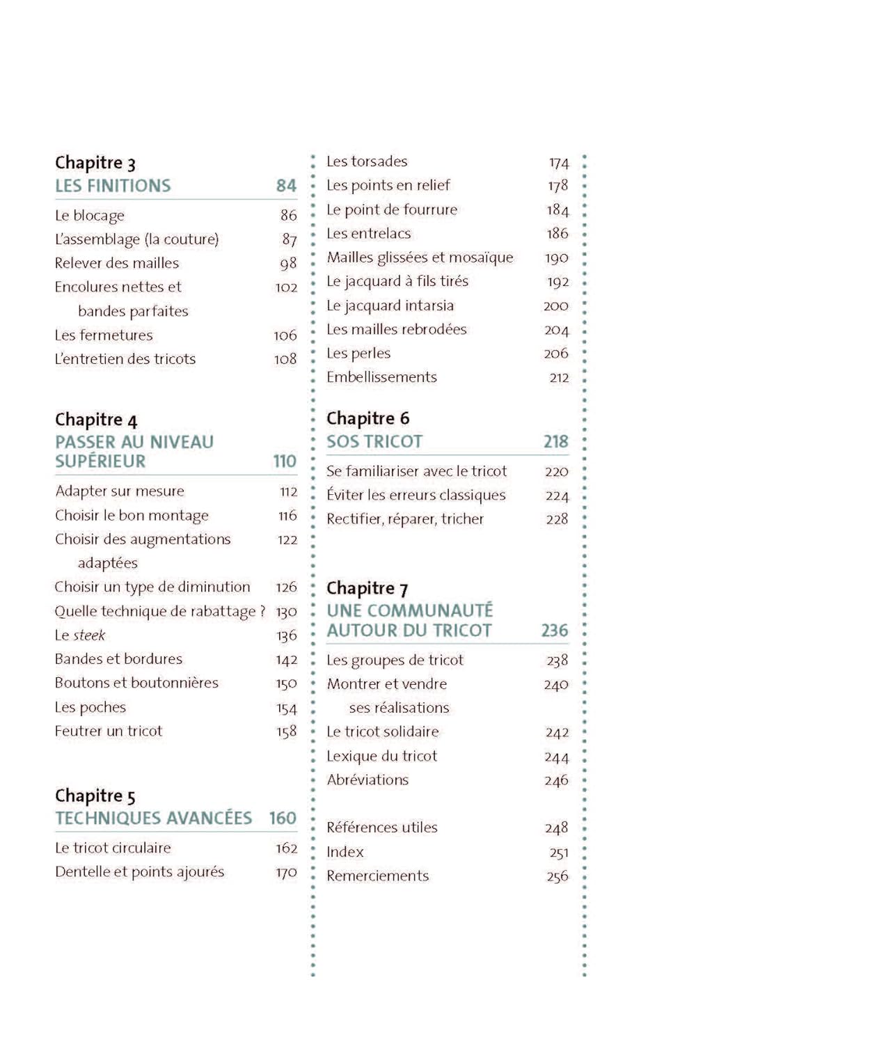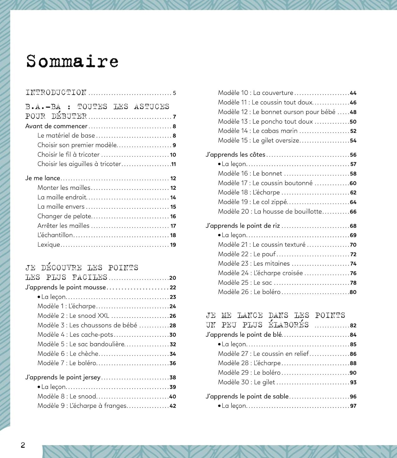 Vous y découvrirez toutes les bases indispensables pour débuter, illustrées de nombreuses photos : le montage des mailles, les différents points, les augmentations et diminutions, les torsades… et même comment rattraper vos erreurs !