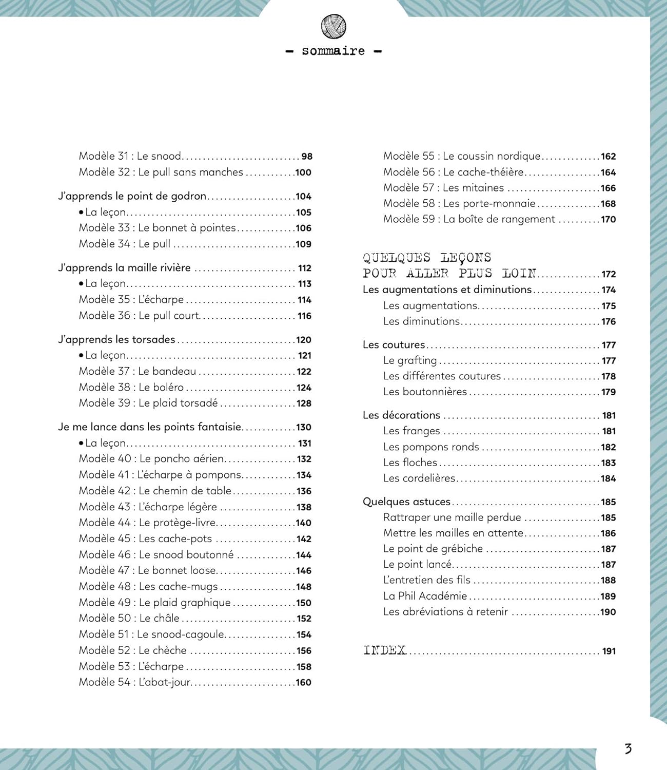 Elles apprendront ainsi d’abord à monter les mailles ou faire des mailles envers et endroit, avant de se lancer dans le point mousse, puis le jersey, les côtes, le point de riz… jusqu’aux points fantaisie. Et pour passer rapidement à la pratique et rester motivée, chaque leçon est suivie d’une sélection de jolis modèles à réaliser : snoods, coussins, bonnets, plaids, premiers pulls ou gilets…