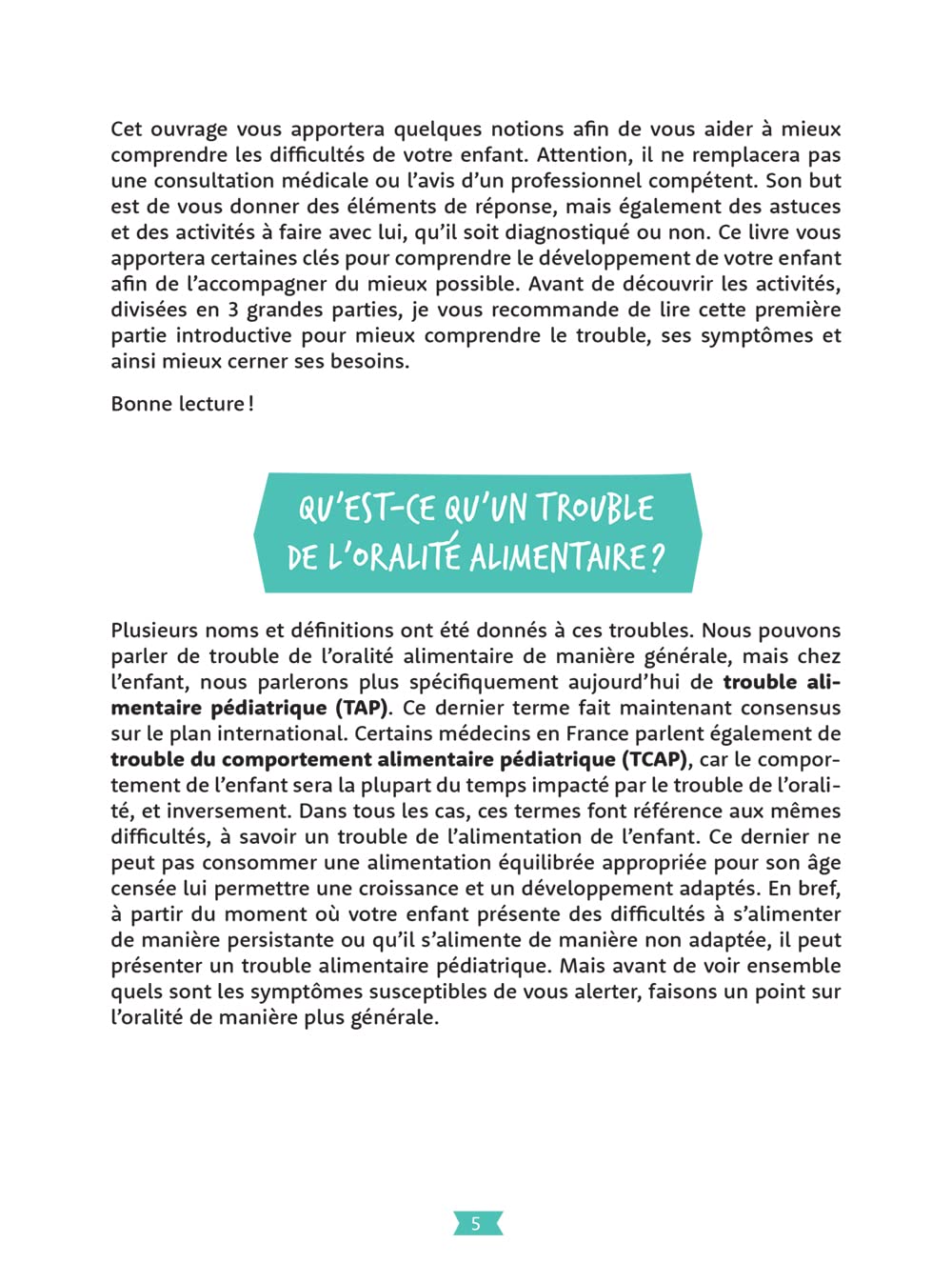 Ce livre vous aidera à comprendre ce qu’est un trouble de l’oralité alimentaire et comment le prendre en charge au quotidien. Mais plus encore, il vous montrera que vous n’êtes pas seul.e et qu’il existe de nombreuses activités à faire avec votre enfant pour l’accompagner et l’aider à appréhender ce trouble. Croyez-le, votre enfant est capable d’accomplir de grandes choses chaque jour !
