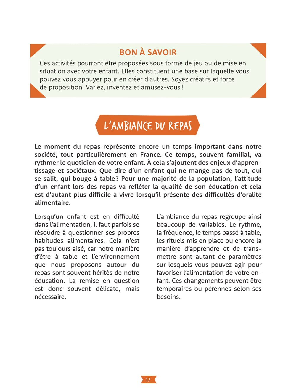 Ce livre d’activités va vous aider à aider votre enfant ! Élaboré par un ergothérapeute spécialiste des troubles de l’oralité, cet ouvrage vous donne toutes les infos, astuces et activités pour mettre en place à la maison des temps ludiques et joyeux qui viendront compléter les apprentissages pendant les repas, ou les séances chez un spécialiste.