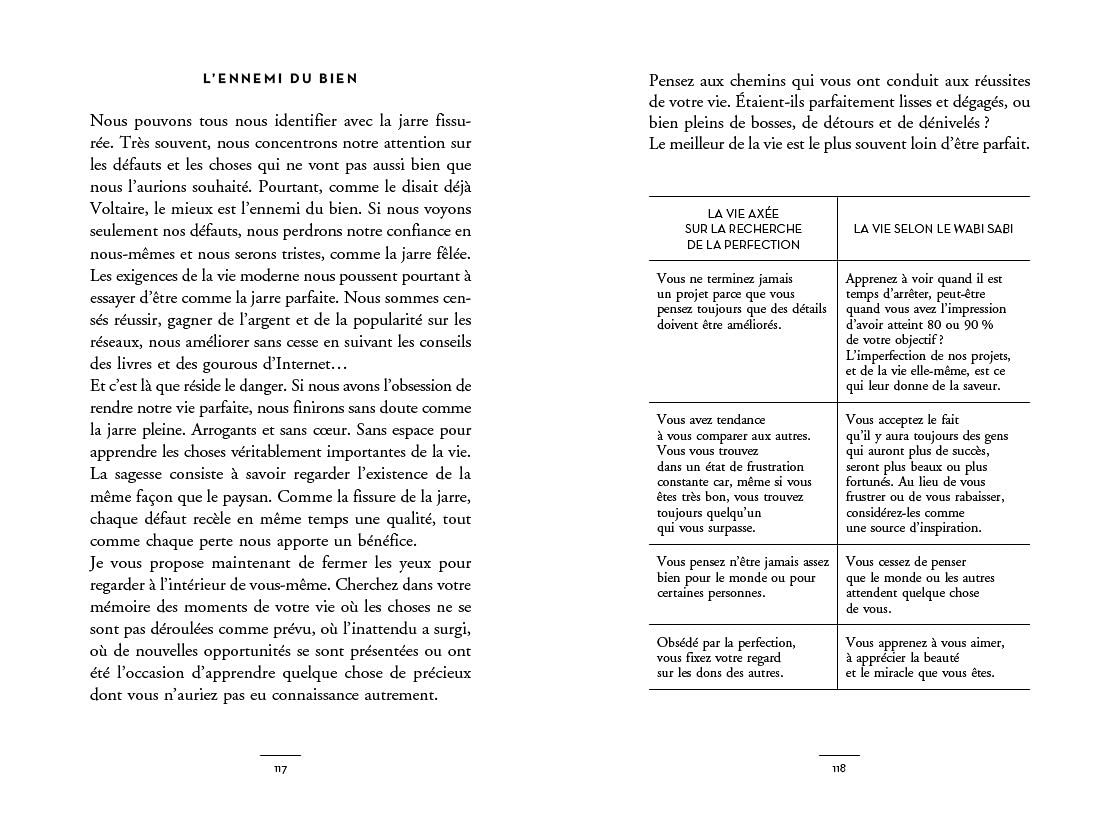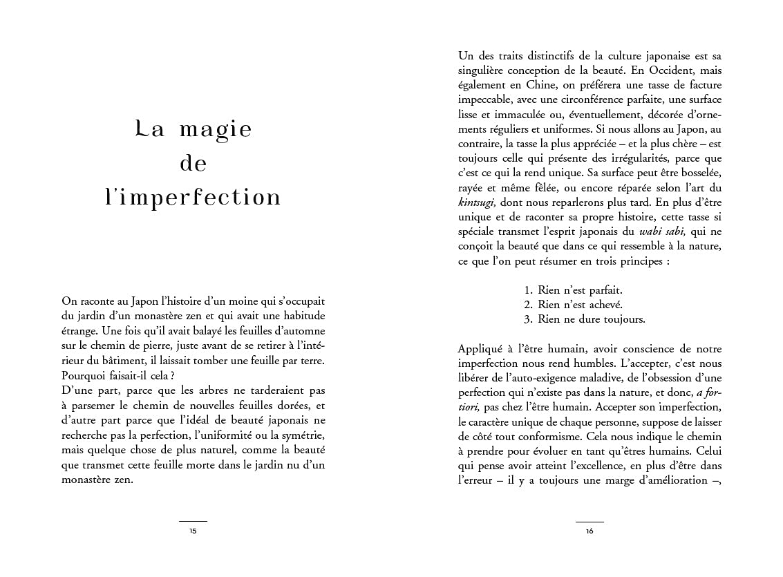 Ainsi devrions-nous renoncer à la quête incessante et illusoire de la perfection, du bonheur et de la réussite pour cultiver la beauté de l’imperfection, l’impermanence, l’authenticité, la richesse et la joie des choses simples. Et apprendre aussi à conjuguer nos vies à l’imparfait en nous acceptant avec bienveillance, pour plus de sérénité et de liberté dans notre quotidien.